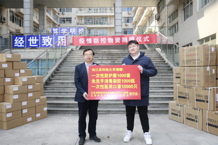 4月8日上午,开云英超官网_开云online(中国)举行疫情防控物资捐赠仪式,2014届优秀校友、江苏淮海数码科技有限公司执行董事张宁远向学校捐赠疫情防控物资助力开学,这批捐赠物资包含一次性医用口罩10000只、一次性防护服1000套、免洗手消毒凝胶1000瓶。