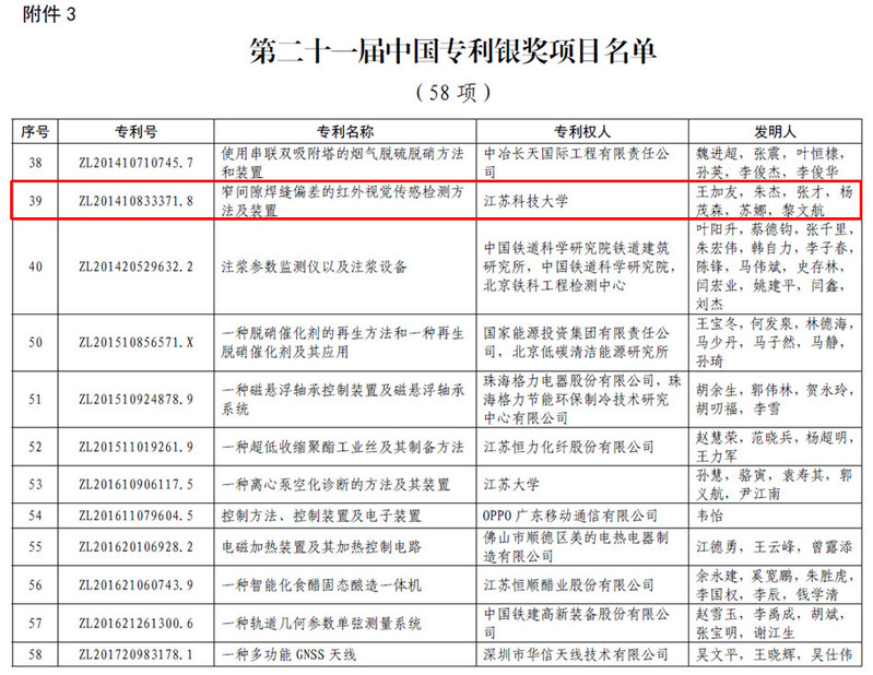 开云英超官网_开云online(中国)王加友副校长获奖的发明专利“窄间隙焊缝偏差的红外视觉传感检测方法及装置(ZL201410833371.8)”,属于基础型专利,主要针对现有技术存在的焊缝偏差传感检测精度低、工程实用性不强等缺点,提出了一种检测精度高、环境适应能力强、适用范围宽、实用性好,特别适用于摇动(或旋转)电弧窄间隙焊缝偏差检测的红外视觉传感检测方法及装置,通过解决窄间隙熔化极电弧焊缝跟踪的共性关键技术难题,推动了摇动及旋转电弧窄间隙焊接新技术的工程应用。该专利2017年6月申请进入美国,2018年2月获得美国专利授权,其授权文本中包含11项权利要求,其中独立权利要求2项。