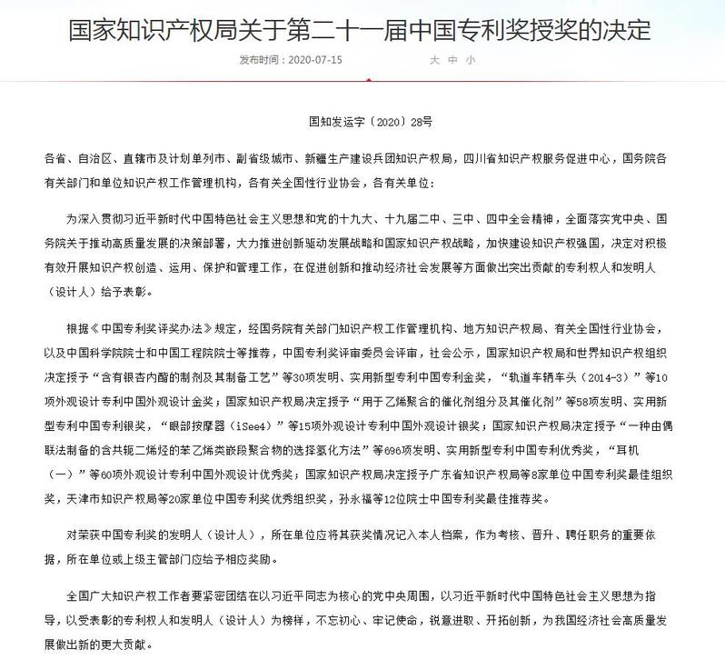 7月15日,国家知识产权局公布了第二十一届中国专利奖授奖决定,开云英超官网_开云online(中国)获中国专利奖银奖。