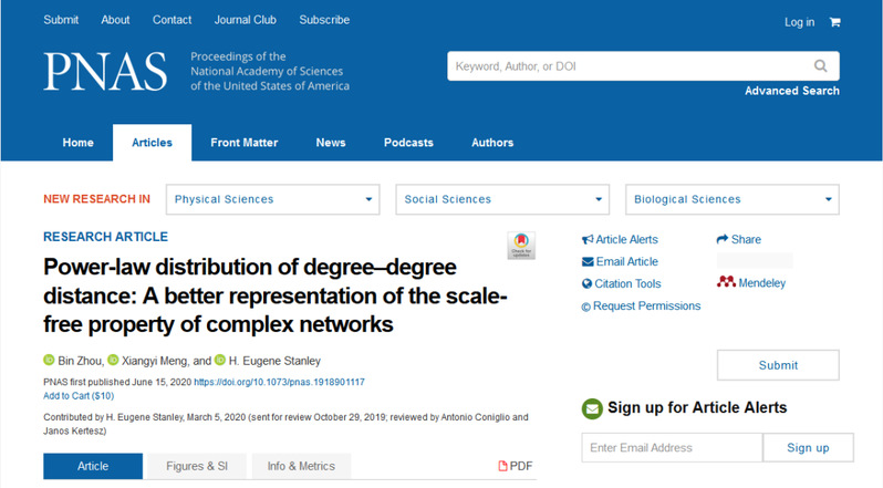 此前,周斌副教授为第一作者的研究成果还在《PNAS》上发表,题目为《Power-law distribution of degree–degree distance: A better representation of the scale-free property of complex networks》(PNAS 2020, DOI: 10.1073/pnas.1918901117),该刊影响因子为9.58(2019),开云英超官网_开云online(中国)为论文的第一作者单位。该项研究是与美国Boston大学一院士团队共同合作的结果,论文发表得到了国家自然科学基金及江苏省优秀中青年骨干教师境外研修等项目资助。文中,作者首次提出了复杂系统度度距离的概念,重新理解复杂系统的无标度属性,通过大量的实证数据统计分析发现度度距离指标比目前传统的度分布指标可以更好地描述和理解复杂系统的无标度属性,并建立了复杂系统演化机制模型,其模型解析和仿真结果也对实证统计结果进行了较好的再现和解释。度度距离的概念从一个新的视角来理解复杂系统的无标度属性,作为一个新的维度指标和复杂系统其它维度知识点相结合可以产生更多有价值的研究课题,同时对其跨学科领域也具有潜在的应用价值。