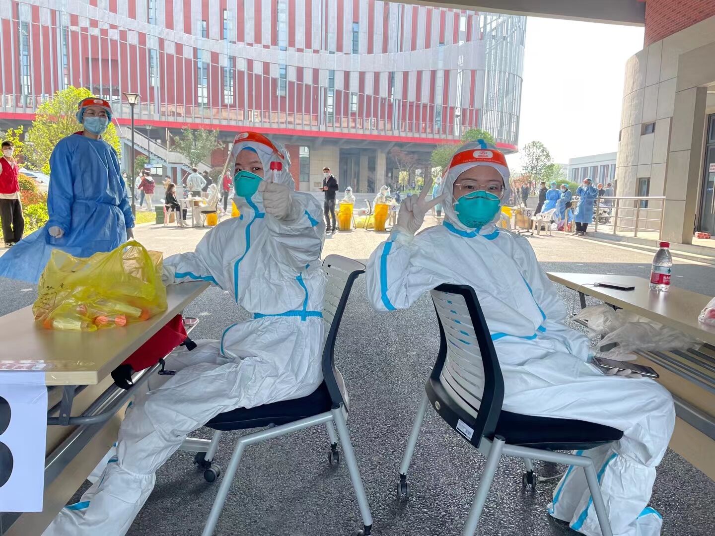 4月12日全员核酸,当天医护人员因为一早从南京赶过来,行程稍有耽搁以致核酸检测延时开展。“我被分到了机动组,从早上7点到中午11点,一直往返于各个检测点之间,填补人员不足。当天的工作结束后回到宿舍,我才发现脚上起了好几个大水泡。”来自腾飞服务社的志愿者王钥瑶多次参与文体中心南门核酸采样点志愿服务以及新冠疫苗接种志愿者等工作,“只有真正参与,才深刻感受到它的艰苦与不易,也更加感动于那些默默奉献者的伟大。”