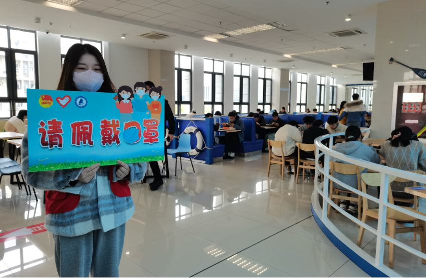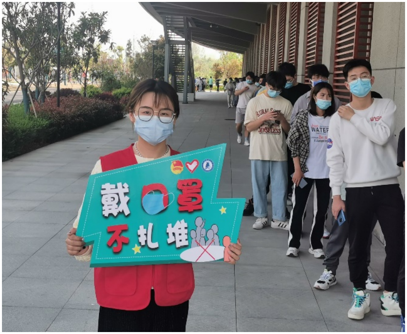 当天从深夜至黎明,首批招募的百余名志愿者响应号召,站在了学校疫情防控第一线。“从每个学院招募10人左右,主要是负责全员核酸检测的秩序维护,还有引导两个食堂就餐人群合理分流、提醒排队师生戴好口罩并保持间隔距离、鼓励同学错峰就餐等。”校团委佘顾雨老师介绍,通过线上培训、精准对接等方式,招募的志愿者分批次、有组织的参与疫情防控工作,并配备小喇叭、红马甲、标语牌等。