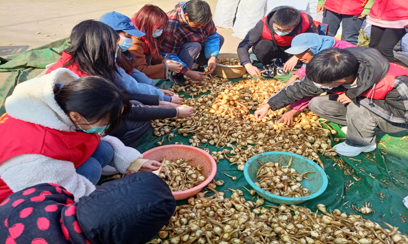 为了将高质量的茨菇运往市场,农户一般采用人工分拣方式,那些又大又圆的茨菇被定义为“优秀”。在分拣现场,志愿者在阿姨们指导下一起筛选合格的茨菇,并将它们一起装袋,共同分享丰收的喜悦。