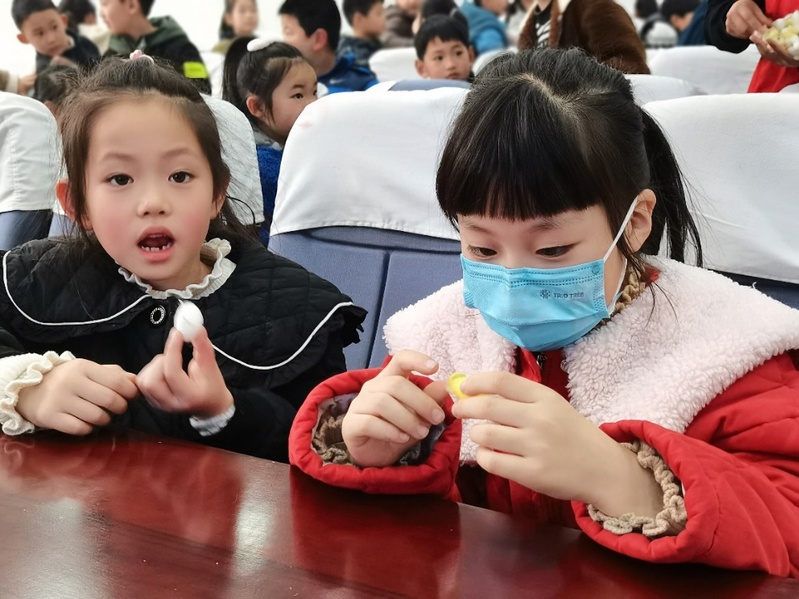 蚕宝宝科普知识讲解完成后,志愿者向小朋友们分发蚕茧,并向他们讲解蚕茧如何制成各类茧丝制品。小朋友们表现出浓厚的兴趣,他们也向志愿者提出自己的疑惑,志愿者们都耐心地解答。活动现场气氛活跃,到处洋溢着欢声笑语。
