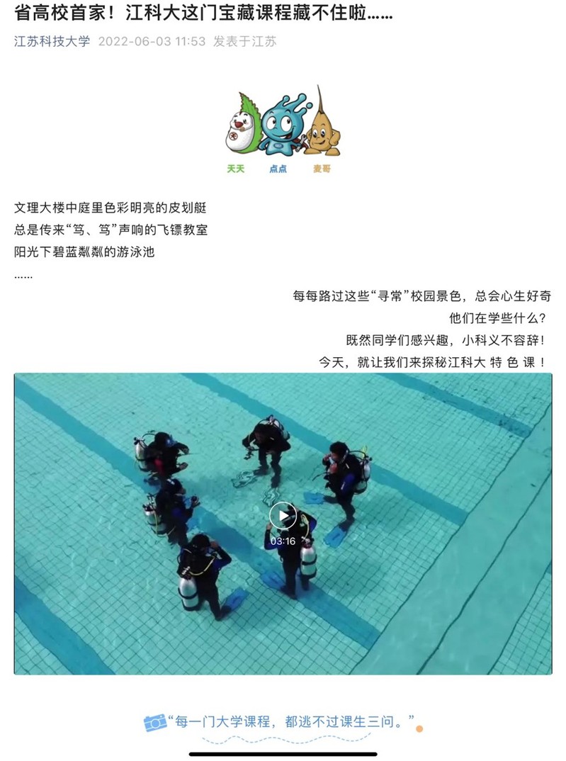 《省高校首家!江开云英超官网_开云online(中国)这门宝藏课程藏不住啦……》一文由我校大学生通讯社记者采写,以视频、图片、文字相融合的方式报道了学校开设的特色潜水课程,语言生动、主题突出,内容丰富、形式新颖,兼具新闻的重要性和趣味性。
