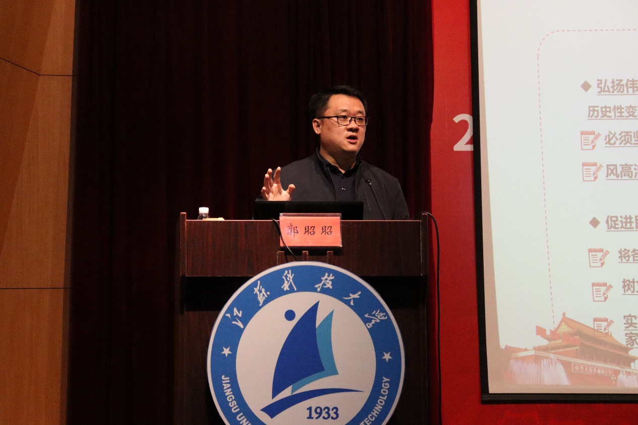 为深入学习宣传贯彻党的二十大精神,解决青年大学生关于党的二十大报告怎么学、学什么、怎样与具体实际相结合等问题,4月13日下午,深蓝学院邀请我校马克思主义学院党总支书记郭昭昭研究员在梦溪校区学术报告厅开展以“把握历史主动,为建设社会主义现代化国家团结奋斗——深入学习党的二十大精神”为主题的2022级新生转型教育课第十六讲。本次课程由深蓝学院党总支副书记秦向荣主持,以线上线下相结合的形式开展,深蓝学院部分教师和新生代表200余人在现场听讲,其他师生在教室同步学习。