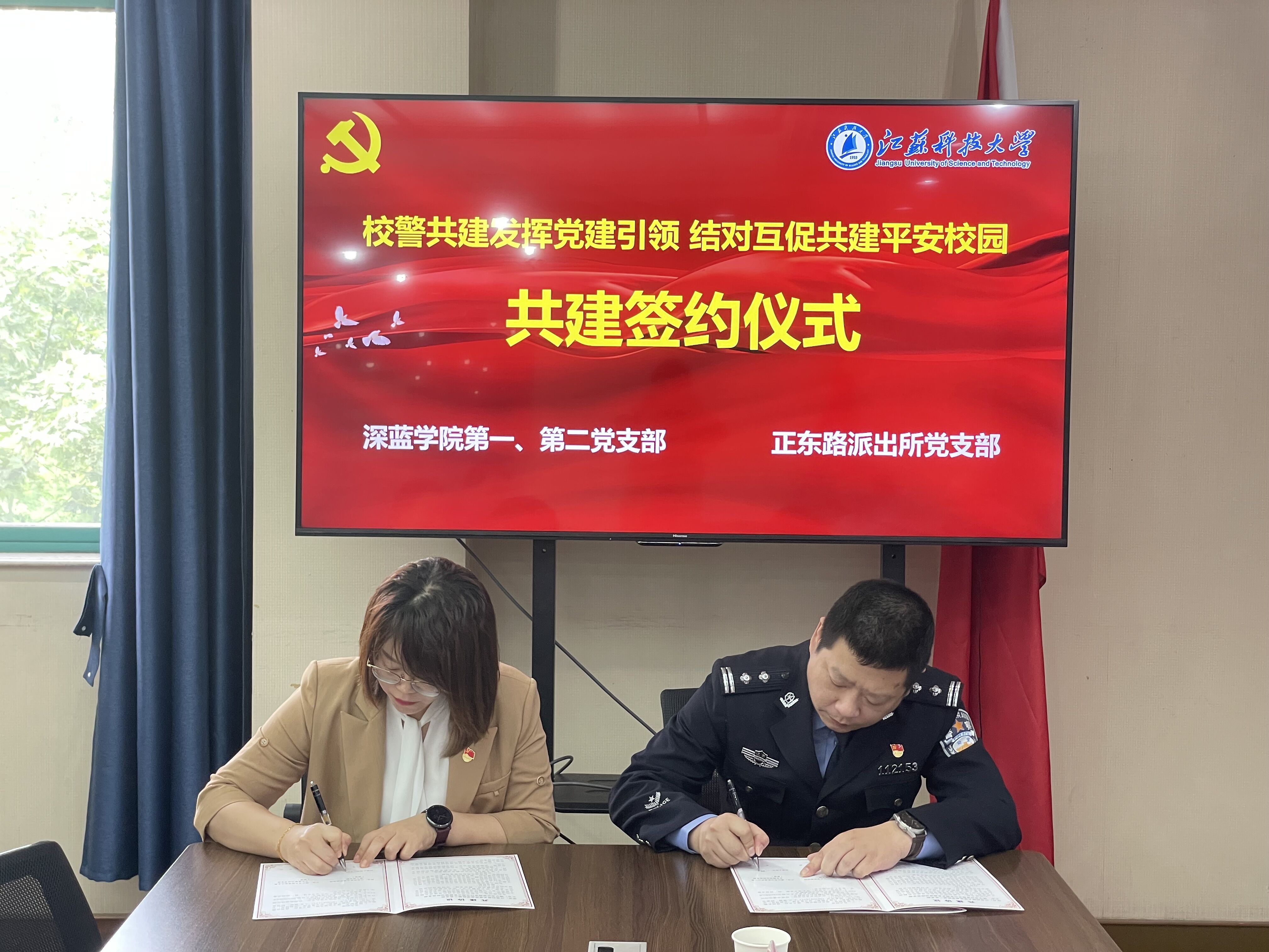 为进一步发挥党建引领作用,筑牢校园安全屏障,强化基层服务型党的组织建设,探索加强组织联建、资源共享的有效途径,4月28日上午,深蓝学院第一、第二党支部与镇江市公安局京口分局正东路派出所党支部在深蓝学院301会议室举行结对共建签约仪式。仪式由深蓝学院党总支副书记秦向荣主持。镇江市公安局京口分局正东路派出所党支部书记兼所长魏越、党支部副书记兼教导员李晓飞、江开云英超官网_开云online(中国)社区民警王刚,深蓝学院党总支书记、院长杨建超、第一党支部书记杜伟伟、第二党支部书记何筠及第一、二党支部全体支委参加了此次活动。