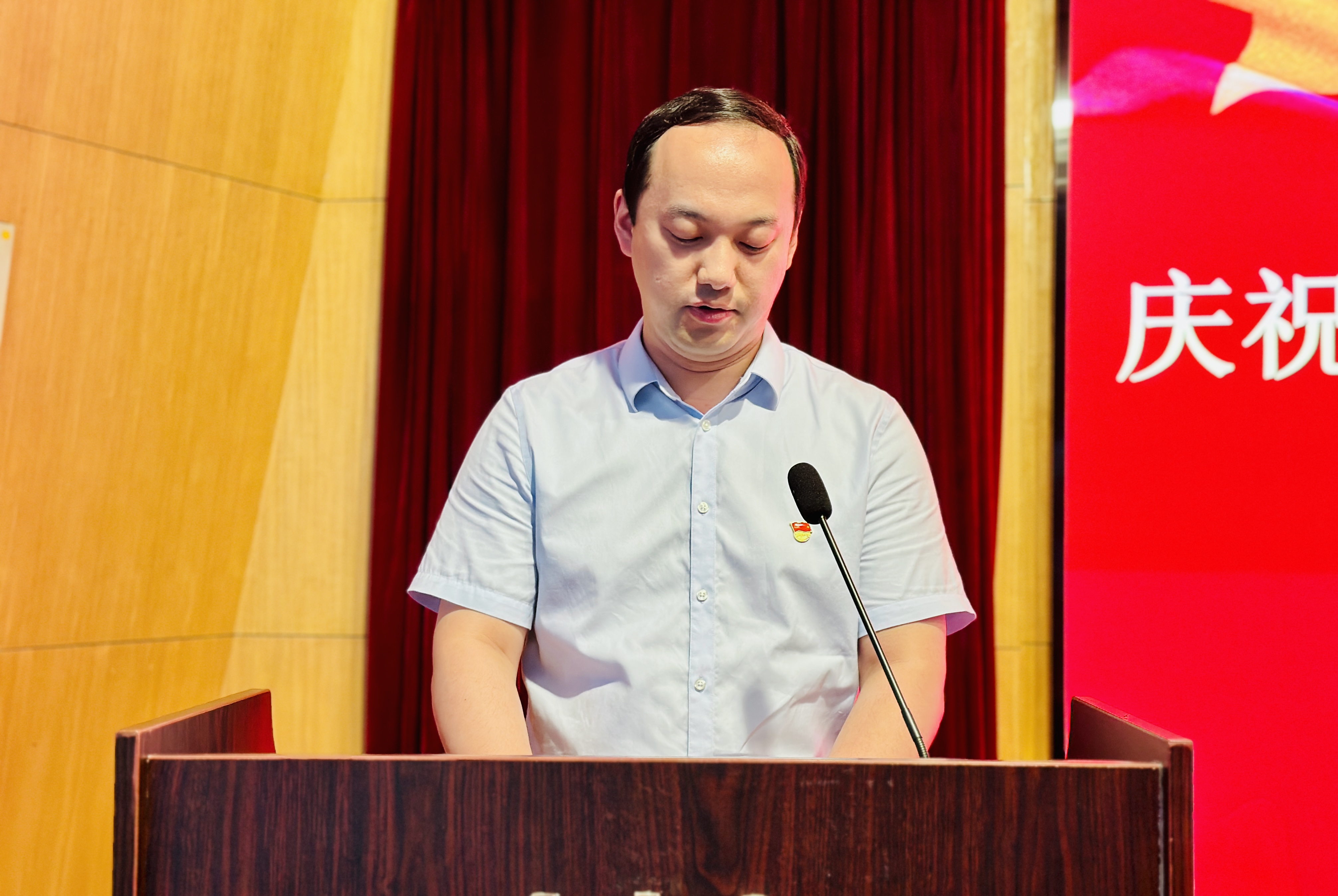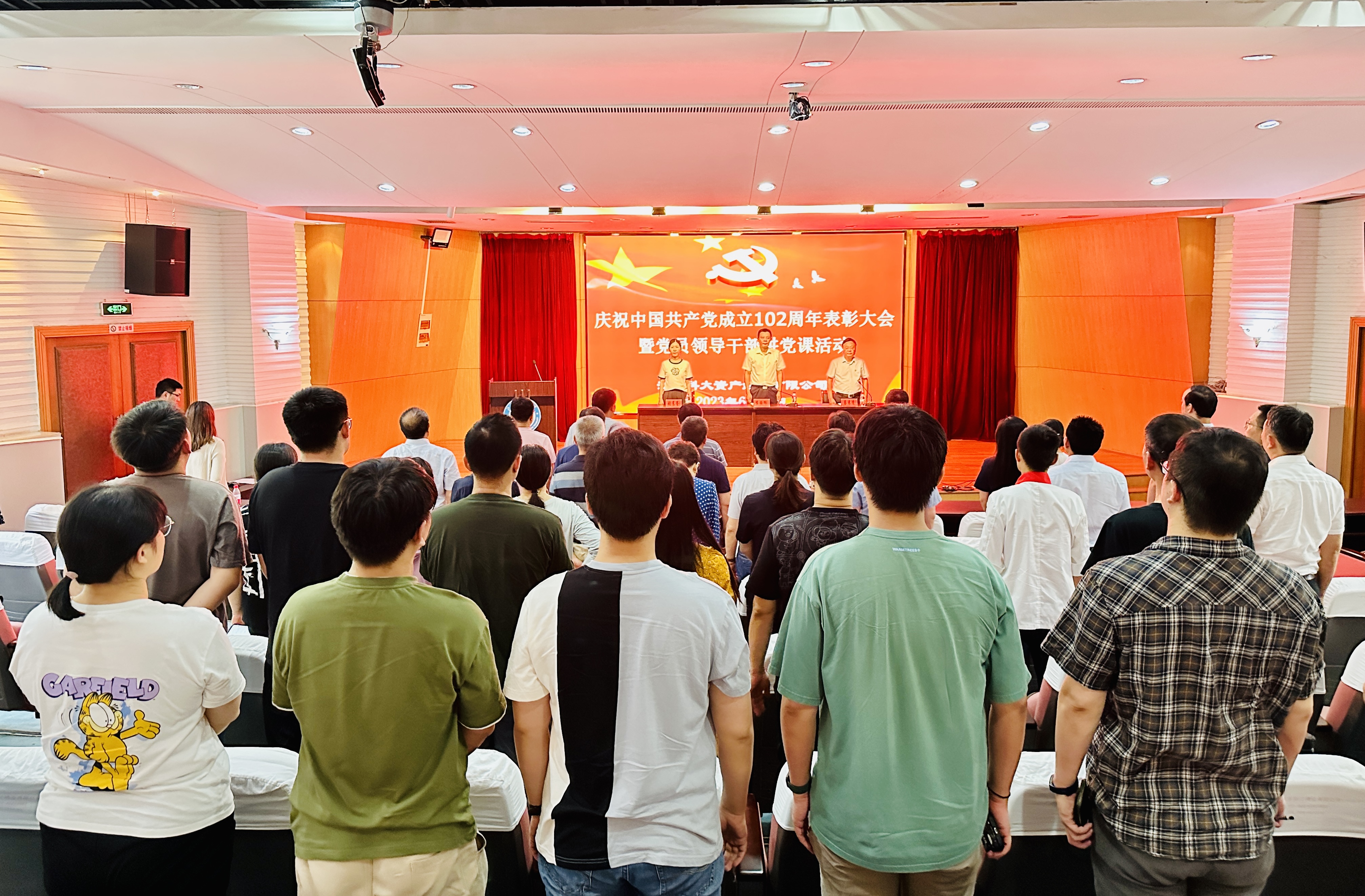 6月29日上午,资产经营公司在梦溪校区学术报告厅举行庆祝中国共产党成立102周年表彰大会暨党员领导干部讲党课活动,公司党工委委员、党员及入党积极分子代表参加会议。党工委委员、副总经理蔡来清主持会议。