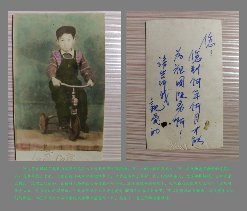 我的父亲在抗日战争时牺牲,母亲也参加了革命工作。1949年无锡解放前夕,母亲在我的照片后留下遗笔:“您!您到何年何月才能为祖国服务啊!请告诉我,亲爱的。”作为革命烈士的后代,是党和人民培养我成为一名大学教师,为人民服务是我的宗旨,振兴中华是我的人生信念。