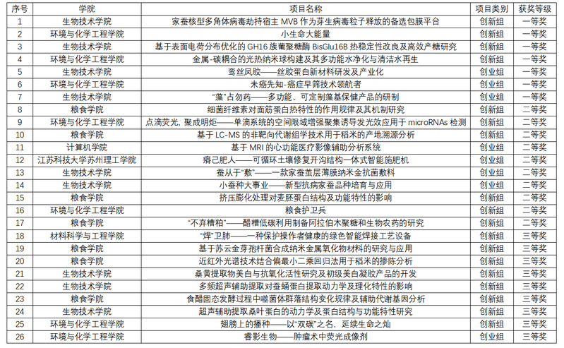 本届大赛学校共有48项作品参赛,生物技术学院、环境与化学工程学院、粮食学院等6个学院的参赛项目团队积极备赛,团结协作。经过网上初审、线下答辩,最终生物技术学院项目《家蚕核型多角体病毒劫持宿主MVB作为芽生病毒粒子释放的备选包膜平台》《基于表面电荷分布优化的GH16族葡聚糖酶BisGlu16B热稳定性改良及高效产糖研究》《鸾丝凤胶——丝胶蛋白新材料研发及产业化》《“藻”占勿药——多功能、可定制藻基保健产品的研制》以及环境与化学工程学院项目《小生命大能量》《金属-碳耦合的光热纳米球构建及其多功能水净化与清洁水再生》《未癌先知-癌症早筛技术领航者》获得一等奖。