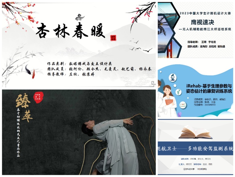 经过各省赛区选拔,全国决赛吸引了500多所高校积极参赛。我校共有5支队伍获得全国赛一等奖:人工智能赛道中,由王琦、于化龙老师指导,计算机学院汤海彤等同学创作的《鹰视速决-无人机辅助的跨江大桥巡检系统》以及左欣、周扬老师指导,计算机学院邓全耀等同学创作的《巡航卫士-多功能安驾监测系统》;物联网赛道中,由张明、王逊老师指导,计算机学院徐永乐等同学创作的《iRehab-基于生理参数与姿态估计的康复训练系统》;数媒游戏与交互设计赛道中,由左欣、张苏婷老师指导,计算机学院张阿伦等同学创作的《杏林春暖》;计算机音乐创作赛道中,由陆鑫、吴健康老师指导,计算机学院田睿文等同学创作的《臻萃》,该作品也是我校首次在计算机音乐创作赛道取得突破。