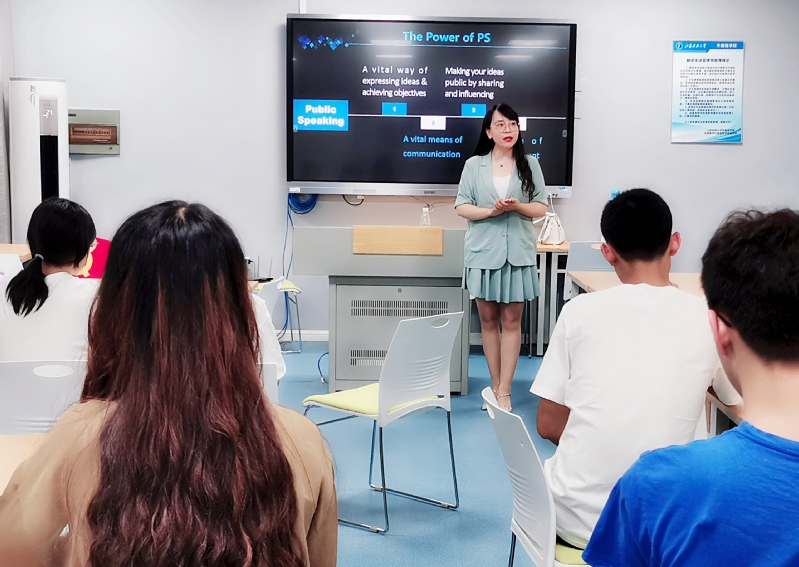 为推进大学英语教学改革,雷飞与大学外语二部老师们对2018级、2020级、2022级三届学生连续三年展开问卷调查,通过数据分析精准了解学生需求,重构大学英语课程群——“必修课夯实语言基础,公选课提升综合能力”。随后,她们面向全校学生开设了一系列公选课。《英语演讲》通过系统训练,帮助学生能够用英文自信展示中华优秀传统文化底蕴;《职场英语》通过职场主题的情景学习和操练,助力学生未来职业发展;《中国文化概论》指导学生用英语讲述中国故事,树立文化自信。