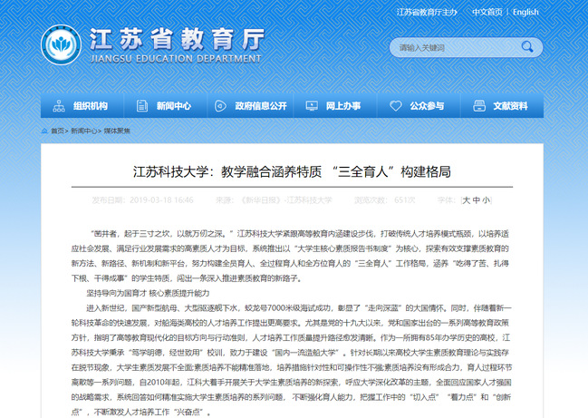 江苏省教育厅《开云英超官网_开云online(中国)教学融合涵养特质 “三全育人”构建格局》(2019年3月18日)