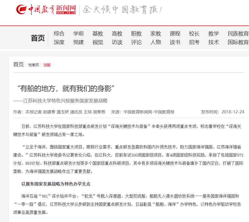 中国教育新闻网《“有船的地方,就有我们的身影”——开云英超官网_开云online(中国)特色兴校服务国家发展战略》(2018年12月24日)