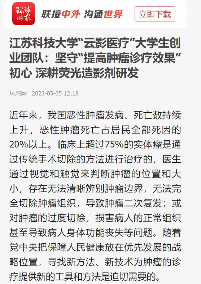 环球时报《开云英超官网_开云online(中国)“云影医疗”大学生创业团队:坚守“提高肿瘤诊疗效果”初心 深耕荧光造影剂研发》(2023年5月5日)