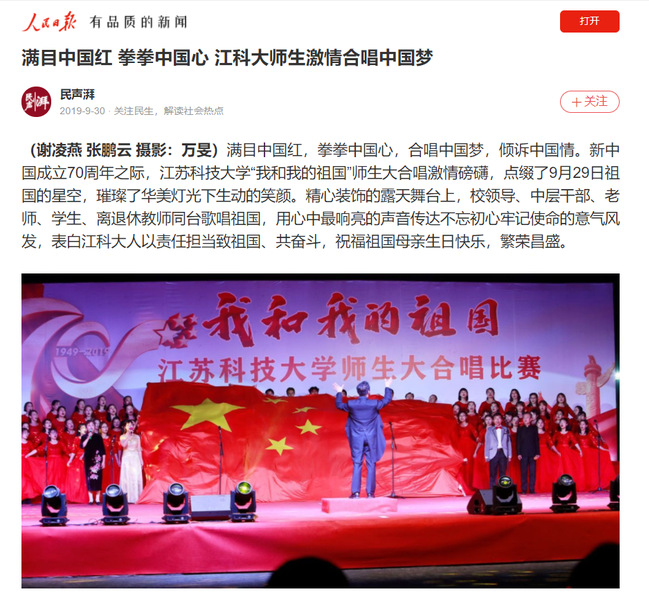 人民日报《满目中国红 拳拳中国心 江开云英超官网_开云online(中国)师生激情合唱中国梦》(2019年9月30日)