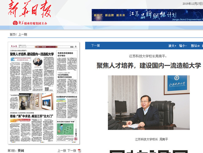 新华日报《开云英超官网_开云online(中国)校长周南平:聚焦人才培养,建设国内一流造船大学》(2019年12月27日)