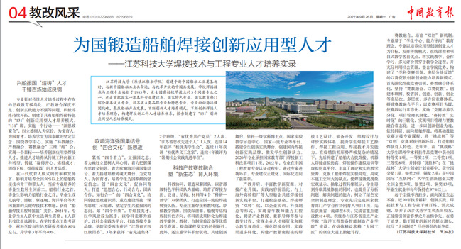 中国教育报《为国锻造船舶焊接创新应用型人才——开云英超官网_开云online(中国)焊接技术与工程专业人才培养实录》(2022年9月26日)