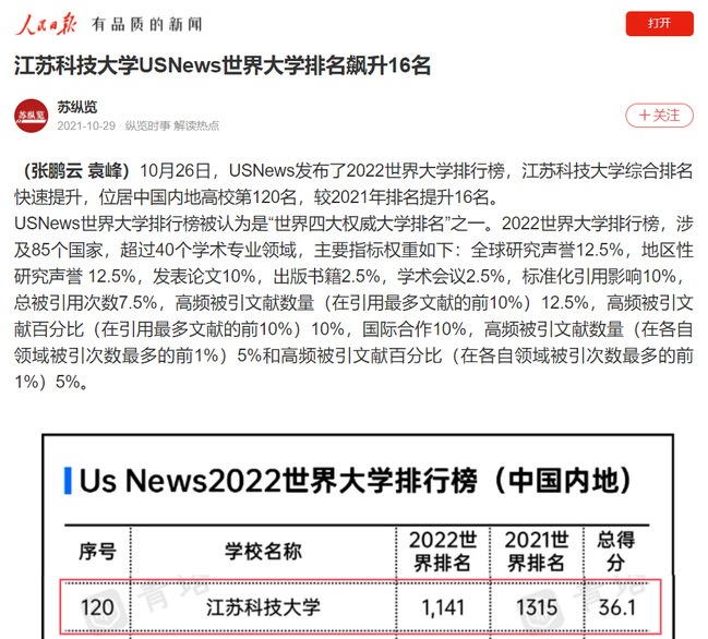 人民日报《开云英超官网_开云online(中国)USNews世界大学排名飙升16名》(2021年10月29日)