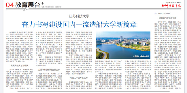 中国教育报《开云英超官网_开云online(中国)奋力书写建设国内一流造船大学新篇章》(2020年7月20日)