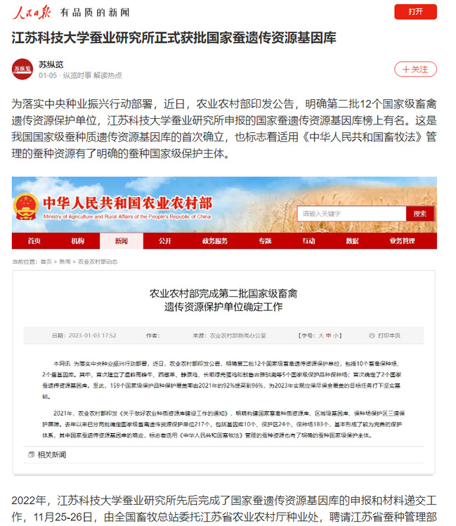 人民日报《开云英超官网_开云online(中国)蚕业研究所正式获批国家蚕遗传资源基因库》(2023年1月5日)