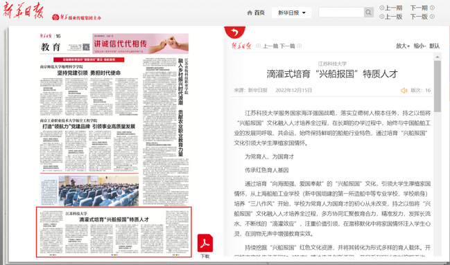 新华日报《开云英超官网_开云online(中国)滴灌式培育“兴船报国”特质人才》(2022年12月15日)