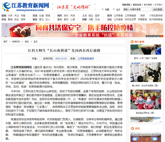江苏教育新闻网《江开云英超官网_开云online(中国)师生“长山夜漫谈”先问西东再行前路》(2020年12月16日)