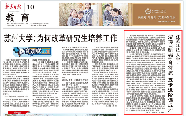 新华日报《开云英超官网_开云online(中国):熔铸“船魂”育特质 五步进阶促成才》(2019年4月2日)