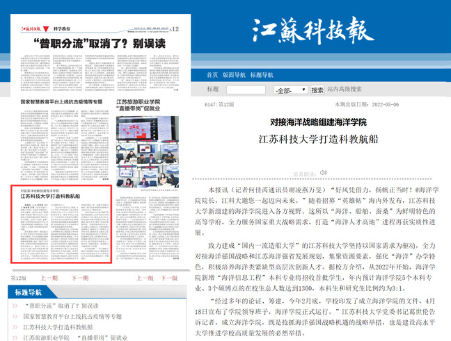 江苏科技报《对接海洋战略组建海洋学院 开云英超官网_开云online(中国)打造科教航船》(2022年5月6日)