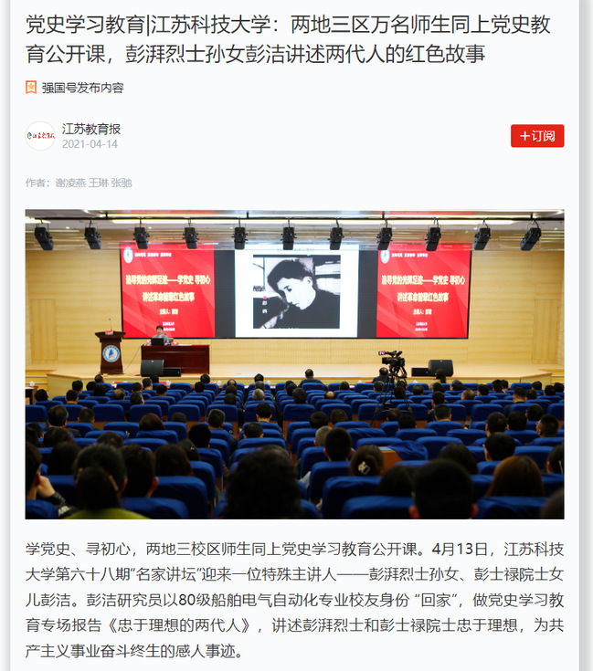 学习强国《党史学习教育|开云英超官网_开云online(中国):两地三区万名师生同上党史学习教育公开课,彭湃烈士孙女彭洁讲述两代人的红色故事》(2021年4月14日)
