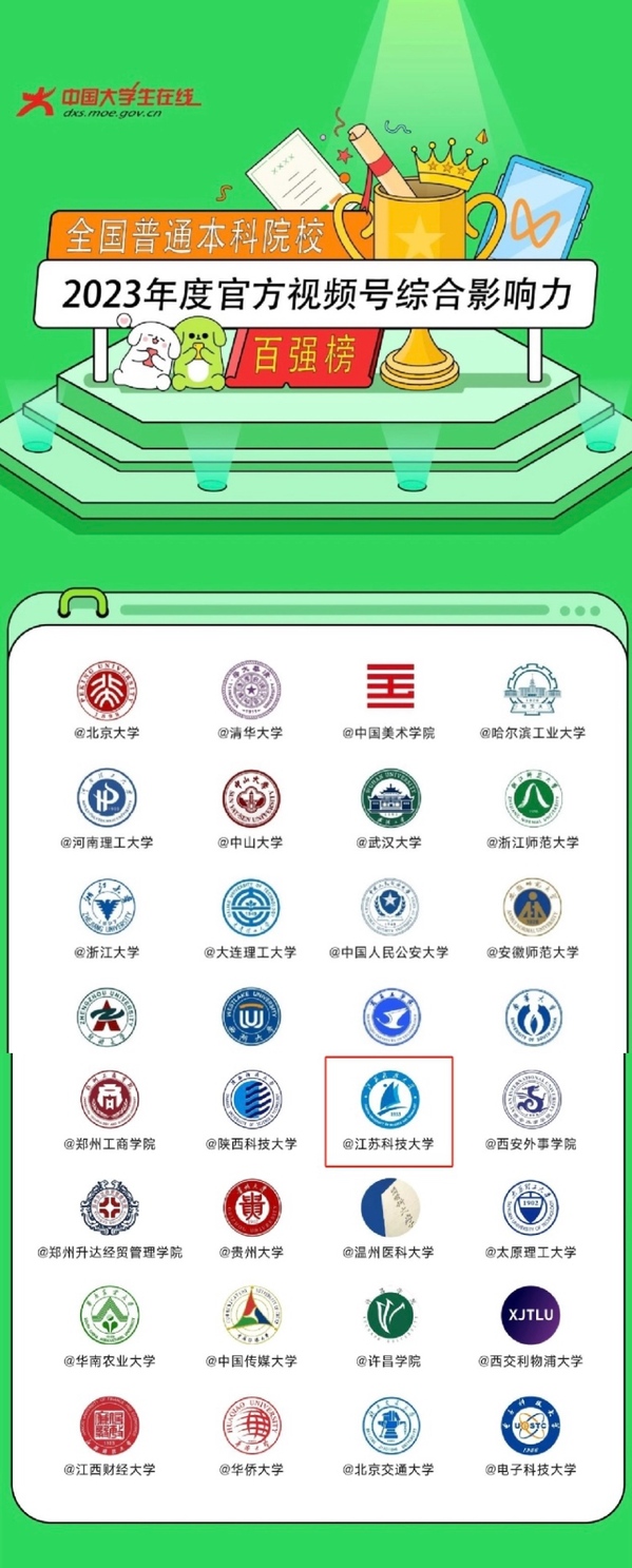 日前,教育部中国大学生在线联合微信官方发布2023年度全国高校官方视频号综合影响力榜单,开云英超官网_开云online(中国)官方视频号荣登全国本科院校2023年度官方视频号综合影响力百强榜。