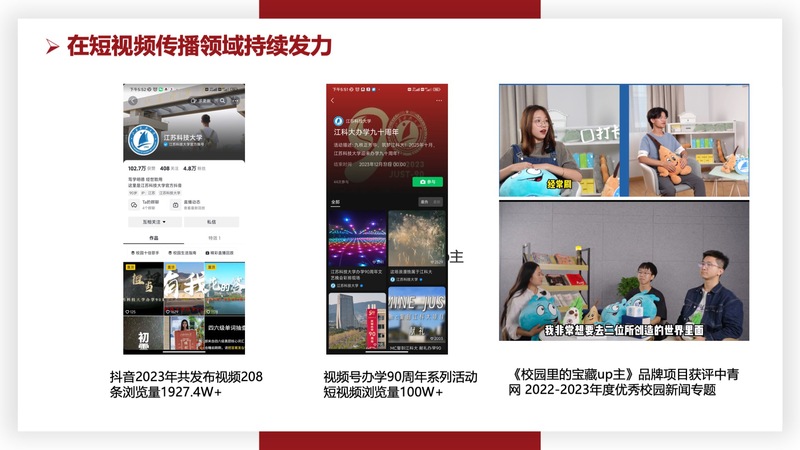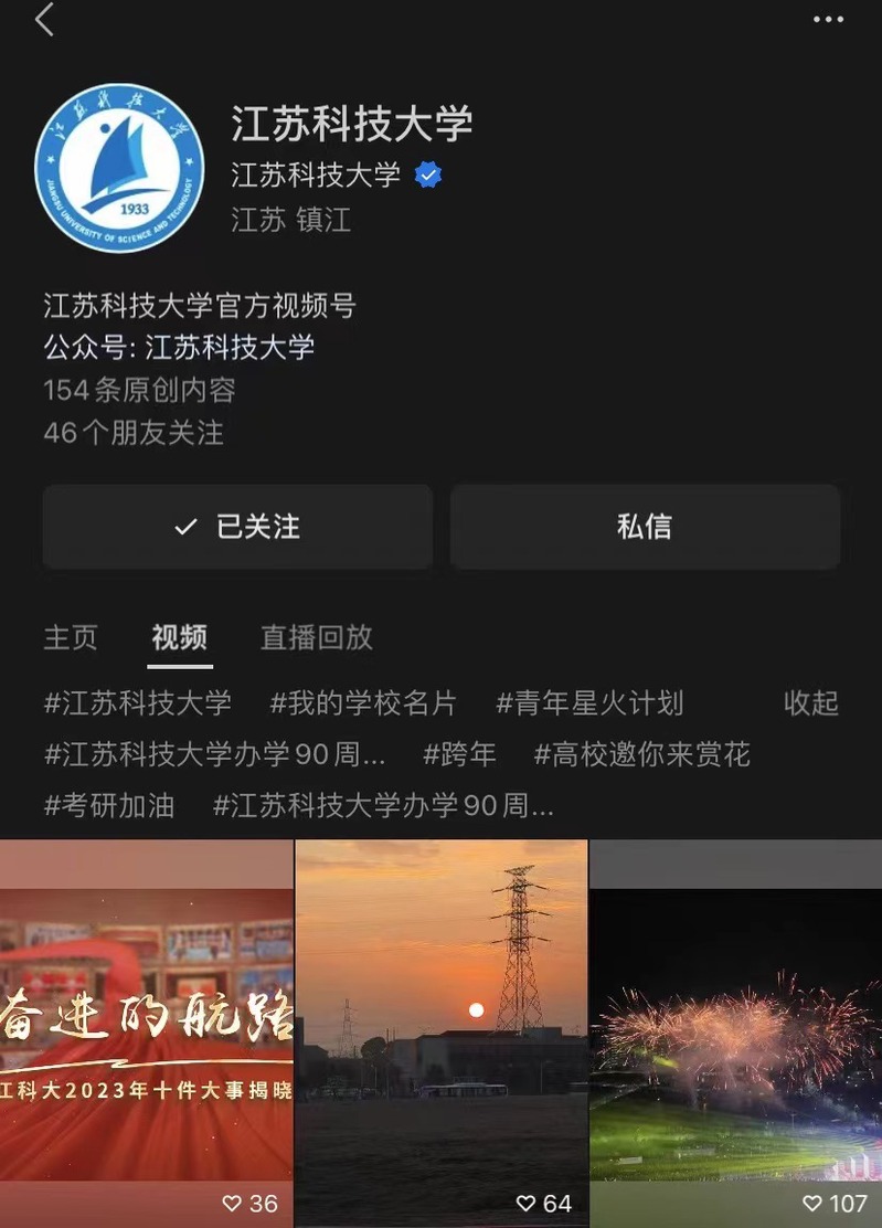 学校官方视频号坚持立德树人根本任务,以制作有思想、有温度、有品质的新媒体作品为目标,作品选题紧贴广大师生关注的时事热点和校园生活,以直观、生动、便捷的形式将学校党建思政、时政大事、校园文化生活等丰富呈现,展现江开云英超官网_开云online(中国)脚踏实地、逐浪前行的奋进姿态与师生昂扬向上、奋发有为的精神风貌。