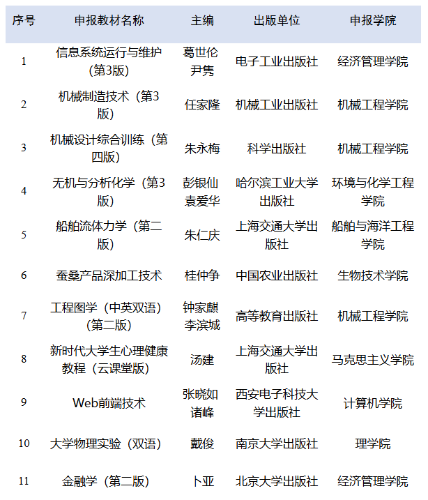 近日,江苏省教育厅公布了“十四五”普通高等教育本科省级规划教材及推荐国家级教材结果,我校共有11部教材入选省级规划教材。其中,《信息系统运行与维护(第3版)》《机械制造技术(第3版)》《机械设计综合训练(第四版)》和《无机与分析化学(第3版》等4部教材被推荐申报教育部“十四五”普通高等教育本科国家级规划教材。