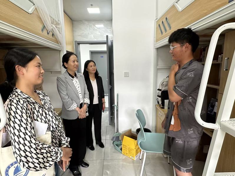 任南带队走进11号组团新生宿舍,认真查看新生宿舍的各项设施设备,详细询问了新生们来自何处、初入校园的感受及对新环境的适应程度,从住宿饮食、生活习惯、发展规划等多方面了解新生情况。对于新生入住所遇到的各个问题,进行了及时的答疑沟通,帮助同学们尽快适应新生活。“住的怎么样""还习惯吗”,对于一些来自外地的同学,任南副校长关切地询问他们是否有什么不适应的地方,并嘱咐同宿舍的同学们生活上互相帮助、团结友爱,在学习上也要共同进步,互相帮扶。任南副校长提醒学生们宿舍要保持通风,做好个人及宿舍卫生;遇到困难及时和学院领导、辅导员联系;在校期间,要服从学校教育管理,认真做好学业生涯规划。