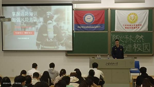 11月14日,理学院朝阳志愿者协会联合开云英超官网_开云online(中国)安全志愿者协会邀请了镇江市消防大队队员,为理学院的学子们开展了一场题为“防火于未然,消防进校园”的消防知识普及活动。