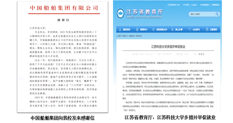 学校人才培养质量得到社会各界和用人单位的广泛认可。中国船舶集团发来感谢信,高度赞扬我校毕业生“吃得了苦、扎得下根、聚得齐心、干得成事”。学校每年毕业去向落实率均达96%以上,在全省就业工作量化考核中连续获得A等。留学生数量逐年增长,培养质量逐年提升,新华日报《科技浇灌友谊树,架起中非“同心桥”》报道我校留学生学成归国助力家乡发展的案例,学校获评“江苏省涉外办学工作先进单位”“江苏省来华留学生教育先进集体”等称号,并获得港澳台地区招生资格,2024年首批招收港澳台学生10人。