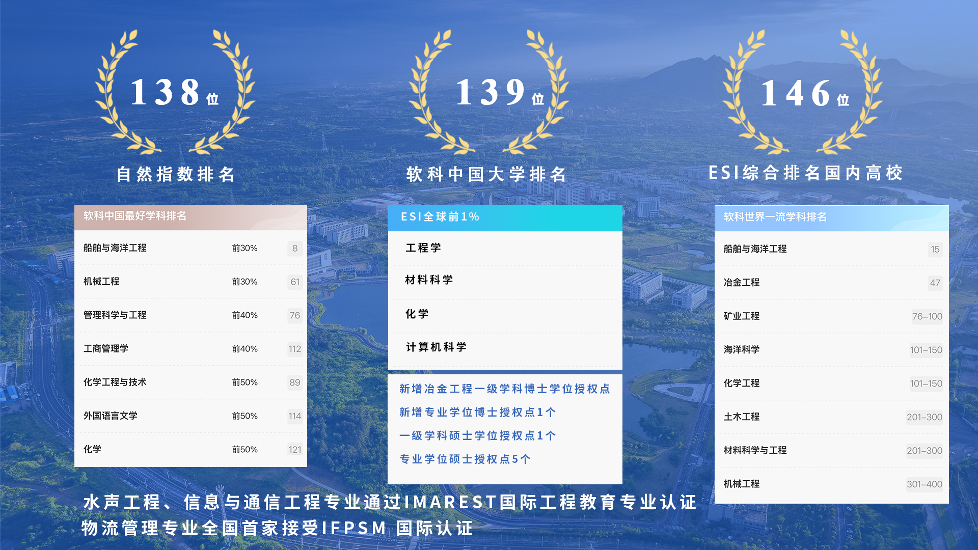 第三方评价机构软科中国大学排名139位,ESI综合排名国内高校第146位,自然指数排名138位,5个学科进入ESI全球前1%。新增冶金工程一级学科博士学位授权点,填补江苏高校该学科博士点空白;新增专业学位博士授权点1个,实现专业学位博士点零的突破,一级学科硕士学位授权点1个,专业学位硕士授权点5个。水声工程、信息与通信工程专业通过IMarEST国际工程教育专业认证。物流管理专业全国首家接受IFPSM 国际认证。获批江苏省卓越工程师学院。