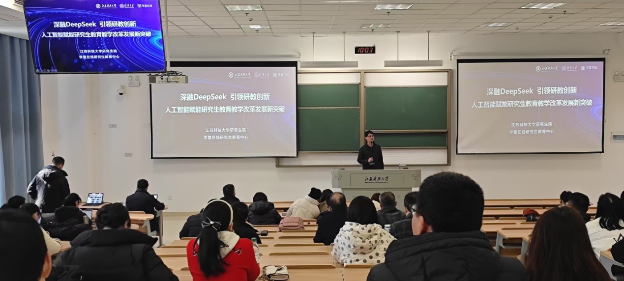 清华大学学堂在线平台江苏区负责人刘帅作题为“深融DeepSeek 引领研教创新——人工智能赋能研究生教育教学改革发展新突破”的专题讲座。他围绕“AI课程是什么”、“要不要做AI课程”、“怎么建设AI课程”、“做好的AI课程什么样”以及“开云英超官网_开云online(中国)研究生在线教学平台AI升级探索”五个方面进行了深入浅出的讲解,为我校AI赋能研究生教育教学提供了宝贵经验和思路指导。