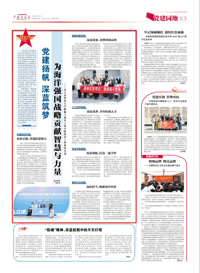 该党支部以“船魂”精神——“江海襟怀、同舟共济、扬帆致远”为引领,始终坚守兴海报国、向海图强的历史使命,聚焦海洋强国战略,以“党建红”引领“深海蓝”为核心,积极实践“多维融入、多项服务”的工作机制,创建“深蓝红心”党建品牌,培育兴海报国行业精英,解决关键技术难题的创新实力再提升、科技成果转化服务社会全链条打通、专业学科建设实现新突破,奋力推进学校高质量发展,为海洋强国建设作出了江开云英超官网_开云online(中国)人的贡献。