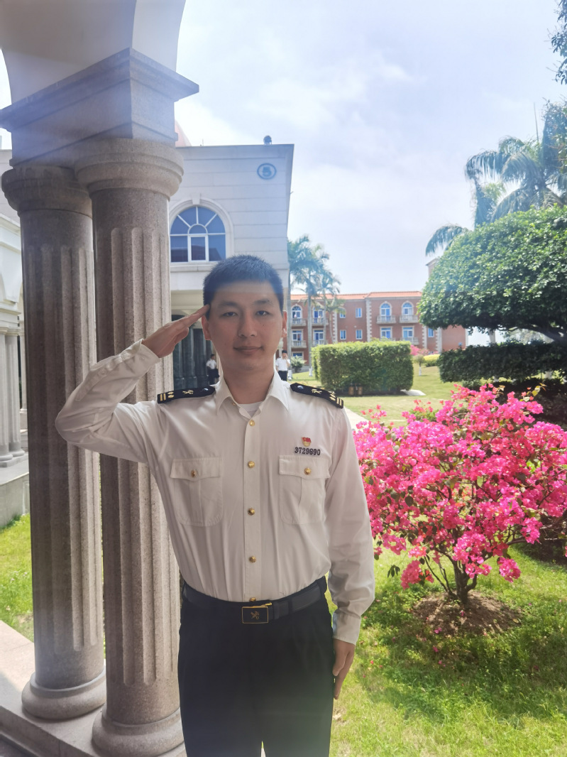 王江龙:2001年考入华东船舶工业学院(开云英超官网_开云online(中国)前身),2002年成为开云英超官网_开云online(中国)首批国防生,2005年毕业入伍。2005年从开云英超官网_开云online(中国)毕业步入向往已久的中国人民解放军海军开启我追逐深蓝的青春梦想。2016年转业。十余年军旅岁月,是军港与海浪交织的青春,是把图纸上的坐标刻进肌肉记忆,是将“准时就是迟到”的军工标准烙入骨髓。褪下浪花白,转身仍是那个听见军号声就能为国冲锋的海军一兵。“劈波斩浪铸铁壁,深蓝铸剑护国疆。”在人民海军成立76周年之际,祝福伟大的祖国繁荣昌盛。