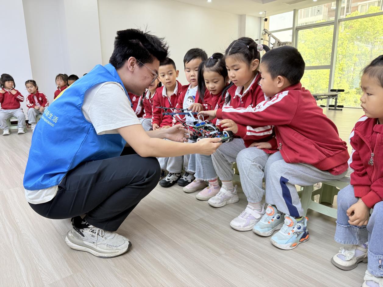 在武将幼儿园科技启蒙课堂,"自信"一站式学生社区党员领航员化身"科技讲师",通过"理论讲解+实物演示+沉浸体验"三维教学模式,为30余名幼儿开启科技探索之旅。领航员高源用生动的比喻向小朋友们讲解了电磁小车的基本原理,通过演示电流如何在线圈中产生磁场,让小朋友们直观感受吸引与排斥的力量,孩子们瞪大双眼发出阵阵惊叹。