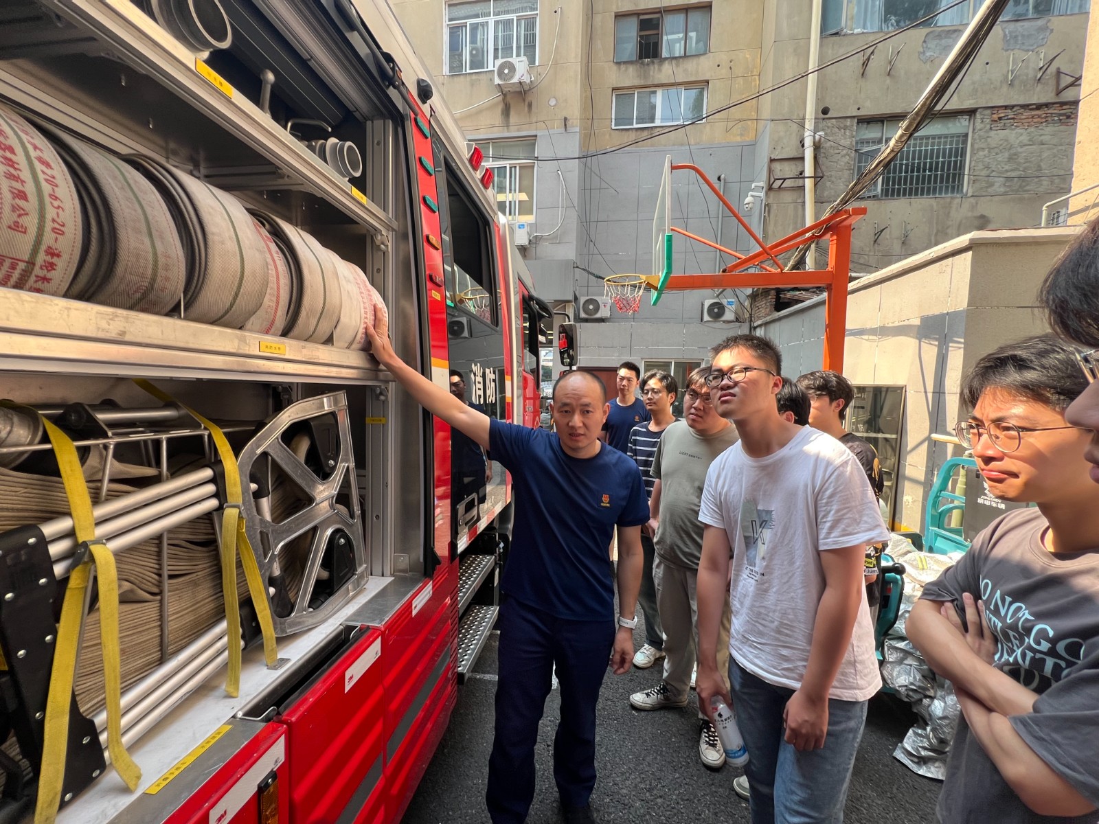 随后,消防救援人员带领同学们参观了各类消防救援车辆和消防救援装备,向他们介绍了不同救援车辆的用途。消防站长结合船海专业特性,对比讲解水上消防难点,学子们纷纷记录要点。消防站随即演示“水雾喷淋系统”模拟船舶灭火场景,研究生分组操作水带连接、战术配合,在实操中深化“防、控、逃”一体化认知。