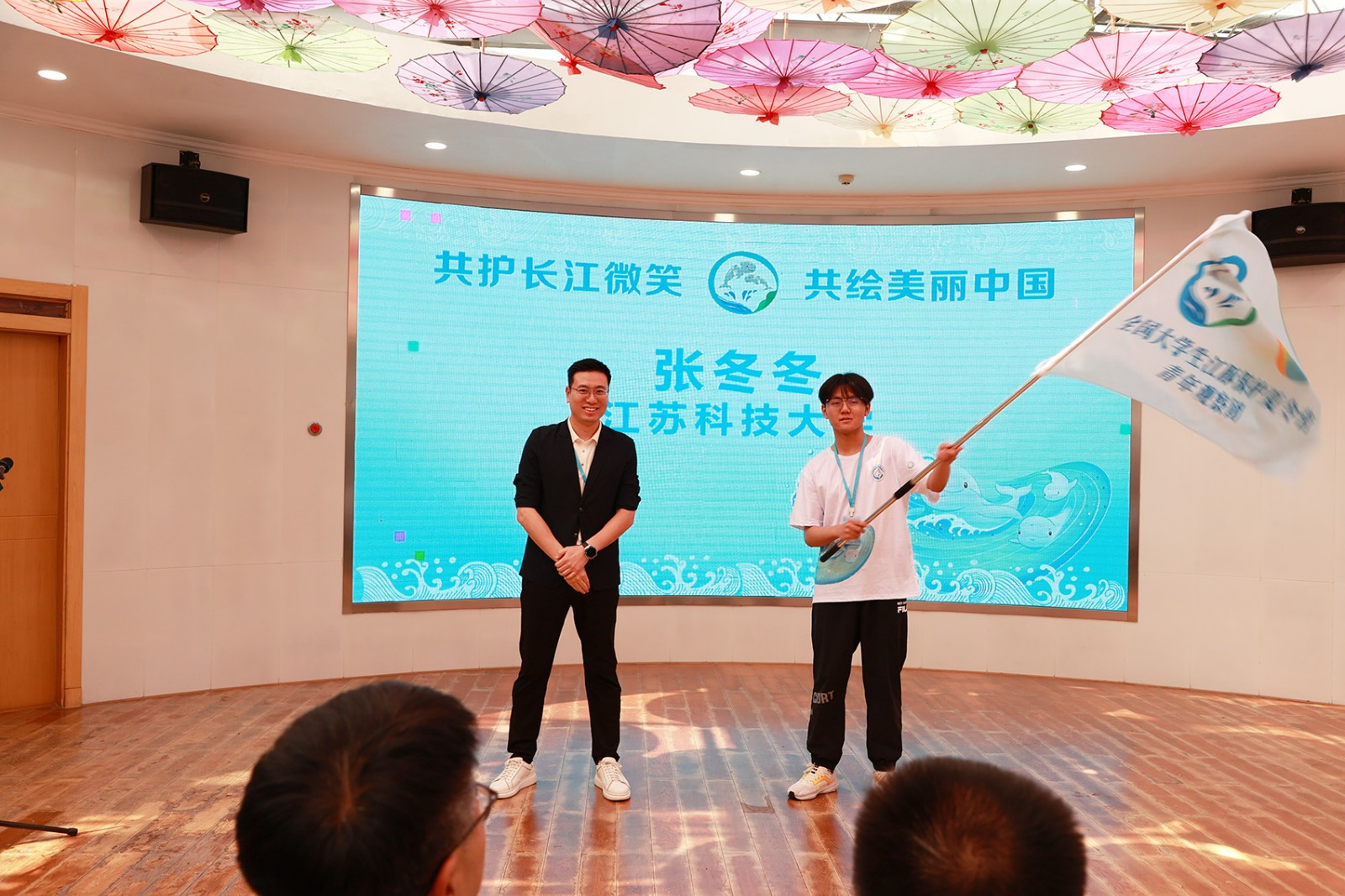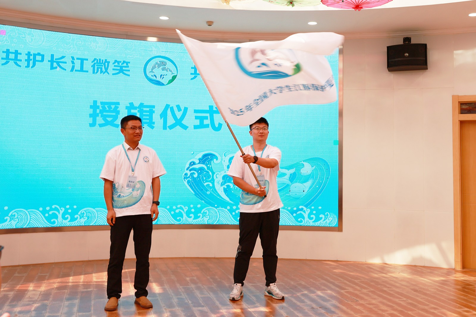 随后,江苏镇江长江豚类省级自然保护区主任王召根为本届夏令营授旗;王新刚为开云英超官网_开云online(中国)、华中农业大学、江苏大学京江学院、武汉职业技术大学长江江豚保护暑期社会实践团授旗;校团委副书记张冬冬为青年观察团授旗。指导单位和主承办单位领导共同为营员佩戴营徽。华中农业大学蓝色精灵江豚保护志愿者团队第十五任队长王静怡同学代表营员发言。