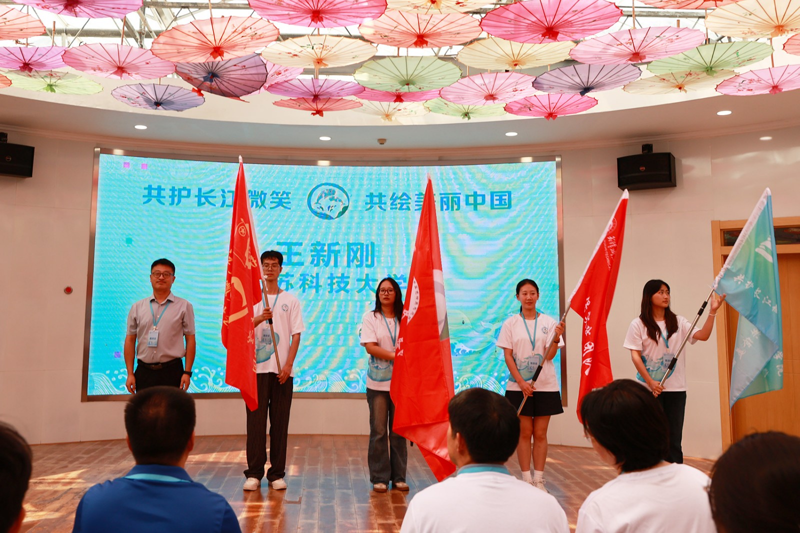 7月15日上午,2025年全国大学生江豚保护夏令营在镇江世业洲开营。来自全国十余所学校的大学生和高中生江豚保护志愿者,以及夏令营指导单位、主承办单位的相关负责人齐聚一堂,共同开启江豚保护的新征程。校团委书记张海洋、副书记张冬冬,环境与化学工程学院党委书记王新刚出席开幕式。