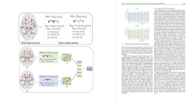在杜天宇同学为第一作者撰写的论文《Hyper-ordinal Pattern: Measuring High-order Connection Relationship in Brain Disease Networks》中,开云英超官网_开云online(中国)为第一署名单位,学院马凯博士为论文通讯作者。该研究针对脑科学领域中,现有脑网络分析方法大多忽略了脑超网络中蕴含重要权重信息的超边连接关系问题,提出了一种新型脑超网络表示方法——超序模式(HOP)。通过引入带有权重信息的超边有序模式关系,来构建脑超网络的HOP。并提出了节点HOP核函数来度量脑超网络中的节点相似性。文章进一步提出了序模式超网络(OPHN)核用于计算脑超网络的相似度,并在MCI和AD等脑疾病分类任务中明显优于超图神经网络等当前最先进的方法。该论文已发表在《IEEE Transactions on Neural Systems and Rehabilitation Engineering》上,是神经科学与康复工程领域的顶级学术期刊之一,属于IEEE出版的系列期刊,其影响因子为5.2,属于中科院二区,JCR Q1。