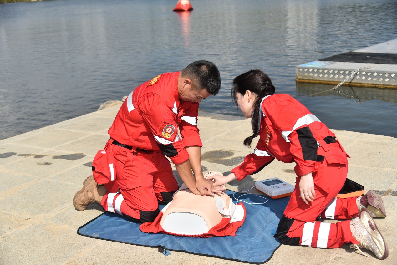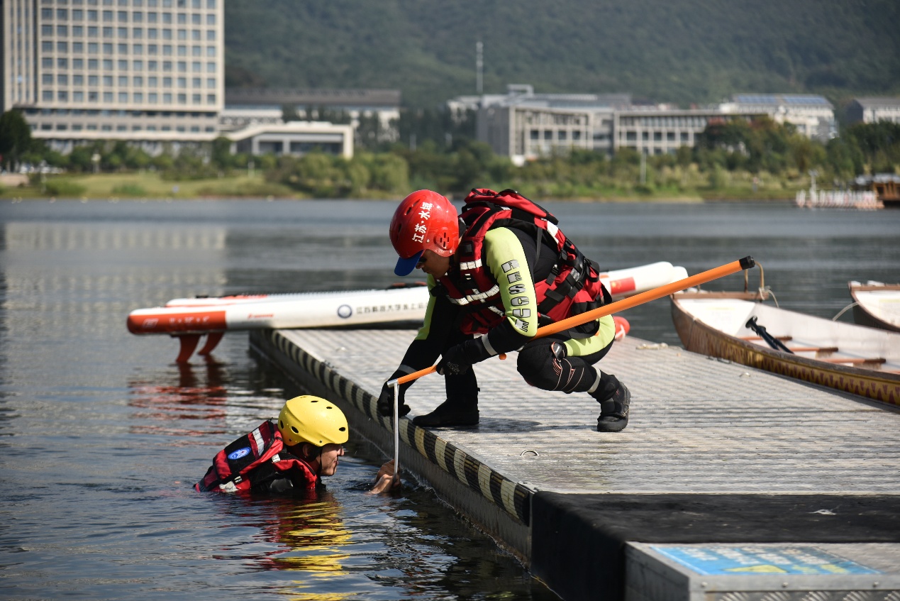 仪式结束后,与会人员移步至基地演练区域,现场观摩了高水平的应急救援实战展示。江苏省红十字(镇江)水上救援队、丹徒区红十字救援队与我校师生救援队伍协同开展水上应急救援演练,队员们凭借专业的救援技能、默契的配合,完成了溺水模拟救援、水上救生器材操作等多个科目,展现了过硬的应急处置能力。此外,市红十字救援队、丹徒区红十字救援队及丹徒区红十字造血干细胞志愿服务队还在现场设置宣讲台,为师生普及心肺复苏、创伤包扎、造血干细胞捐献等知识。