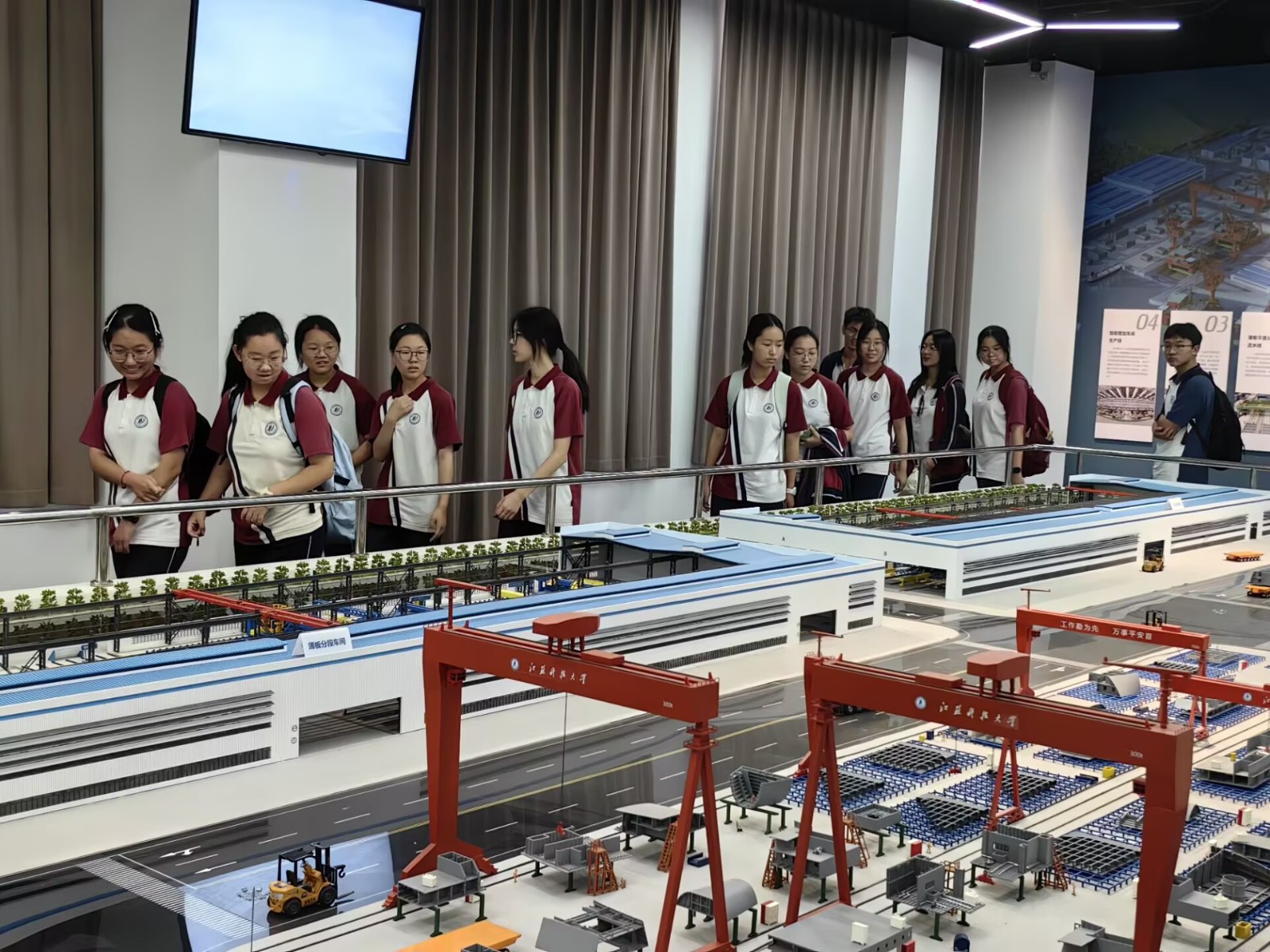 讲座结束后,师生们分批参观了船舶模型馆、船舶制造技术实验室以及校史馆。走进船舶模型馆,仿佛翻开一部立体的“海上教科书”。在志愿者的引导下,师生们依次欣赏精美的大型船模,了解民用与军用船舶知识,对馆藏模型及其背后的船舶工业发展历程有了更深入的认识。学生们对“蛟龙”号载人深潜器、深水半潜式钻井平台981等模型兴趣浓厚,现场气氛热烈。移步船舶制造技术实验室,一座按1:60比例还原的现代造船厂尽收眼底:钢材堆场、切割中心、分段车间、舾装码头……完整呈现了“一块钢板到一艘巨轮”的总装流程。海洋文化润物无声,爱国情怀油然而生——在一艘艘微缩巨轮前,同学们真切感受到科技赋予祖国的底气,也默默把“造更好的船”写进了自己的奋斗目标。
