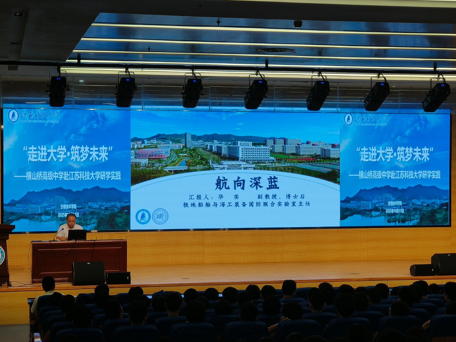 在图书馆B102报告厅,船舶与海洋工程学院华实副教授为横山桥中学的师生们带来了一场题为《航向深蓝》的专题讲座。讲座围绕中国古代船舶的起源、近代船舶的发展、新中国成立初期的船舶工业、改革开放后的技术突破,以及党的十八大以来我国船舶工业取得的重大成就五个部分展开,系统梳理了中国船舶工程与技术的发展脉络。华教授特别介绍了我国自主研制的“雪龙2号”极地科考破冰船,强调其在极地科研和国家战略中的重要意义,引发了同学们的浓厚兴趣。