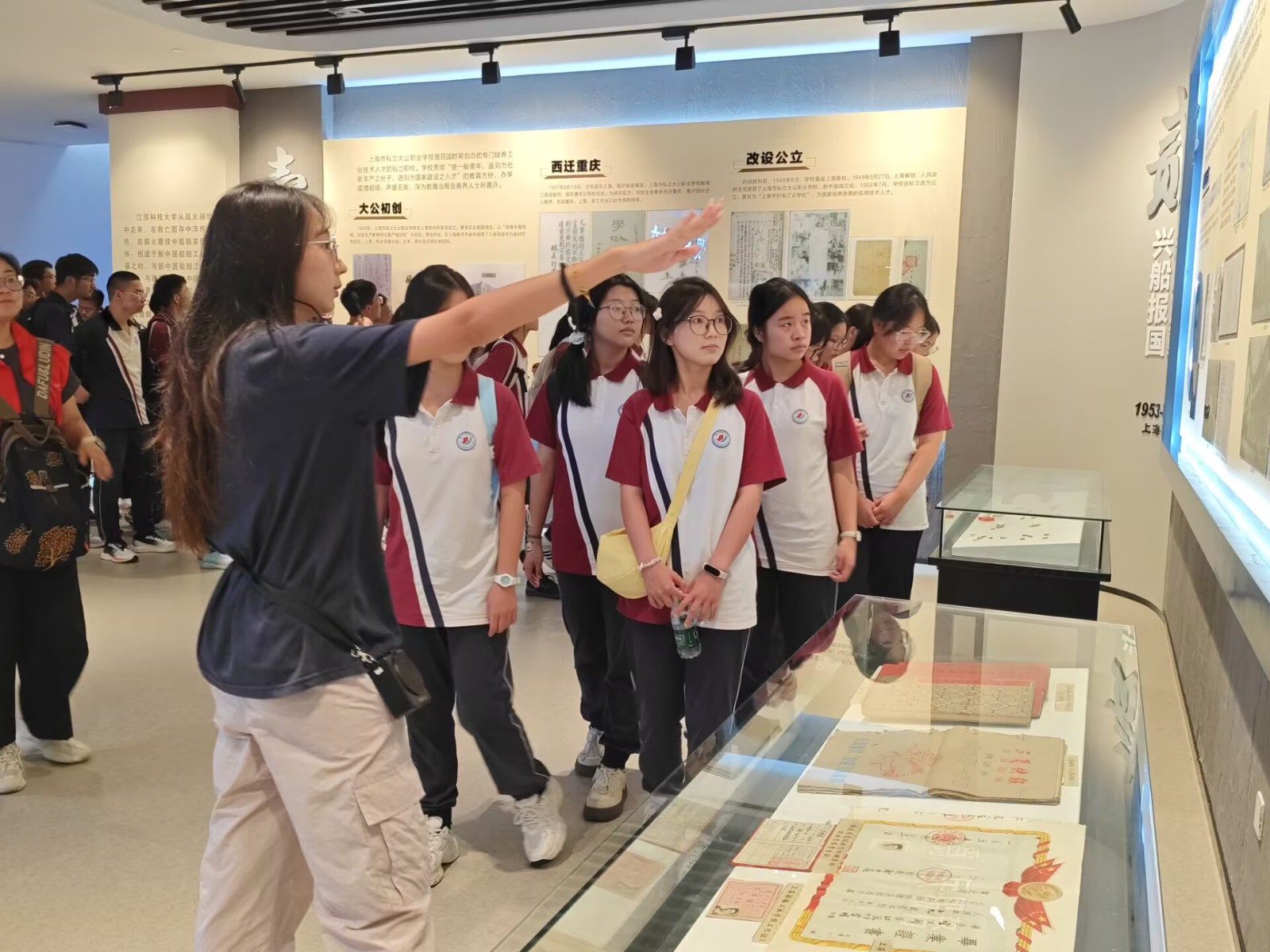 在校史馆,讲解员带领同学们依次走进校史、蚕桑、船舶和科技成果四大展厅。校史厅里,老照片与档案将江开云英超官网_开云online(中国)从“船魂”中诞生、在江海之间成长的历程娓娓道来;蚕桑厅里,缕缕丝线背后,是学校以特色服务“一带一路”的“中国方案”;船舶厅里,模型与实物并列,“兴船报国”的初心可感可触;科技成果厅里,最新专利和转化项目静静陈列,映出学校把论文写在大海与田野上的坚实脚印。一路走、一路看,同学们第一次如此近距离地感受到大学与国家战略、传统文化、前沿科技同频共振的脉搏,也体悟到江开云英超官网_开云online(中国)“兴船报国、服务海洋”的使命担当。